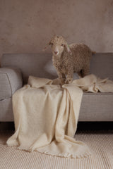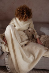 Deze heerlijk warme, zachte en luxe plaid is gemaakt van mohairwol van volwassen angorageiten. Van onze jonge angorageiten maken we onze vesten, truien en sjaals omdat deze wol zacht is voor op de huid. Mohairproducten wordt over het algemeen gemaakt van de jongere geit maar het zou natuurlijk zonde zijn om alleen gebruik te maken van onze jonge dieren en de prachtige wol die de volwassen geiten ons geven niet te gebruiken op een manier die ook kan. Tot nu toe konden we deze wol gebruiken door hem te mengen met andere wolsoorten. Van onze volwassen geiten maken we nu Aukje! We zijn erg blij dat we met deze plaids een goede bestemming hebben voor onze volwassen mohair die een wat grovere structuur heeft dan jonge mohair. Ondanks de iets grovere structuur heeft de mohair als fijne eigenschap dat het nog steeds erg zacht is.